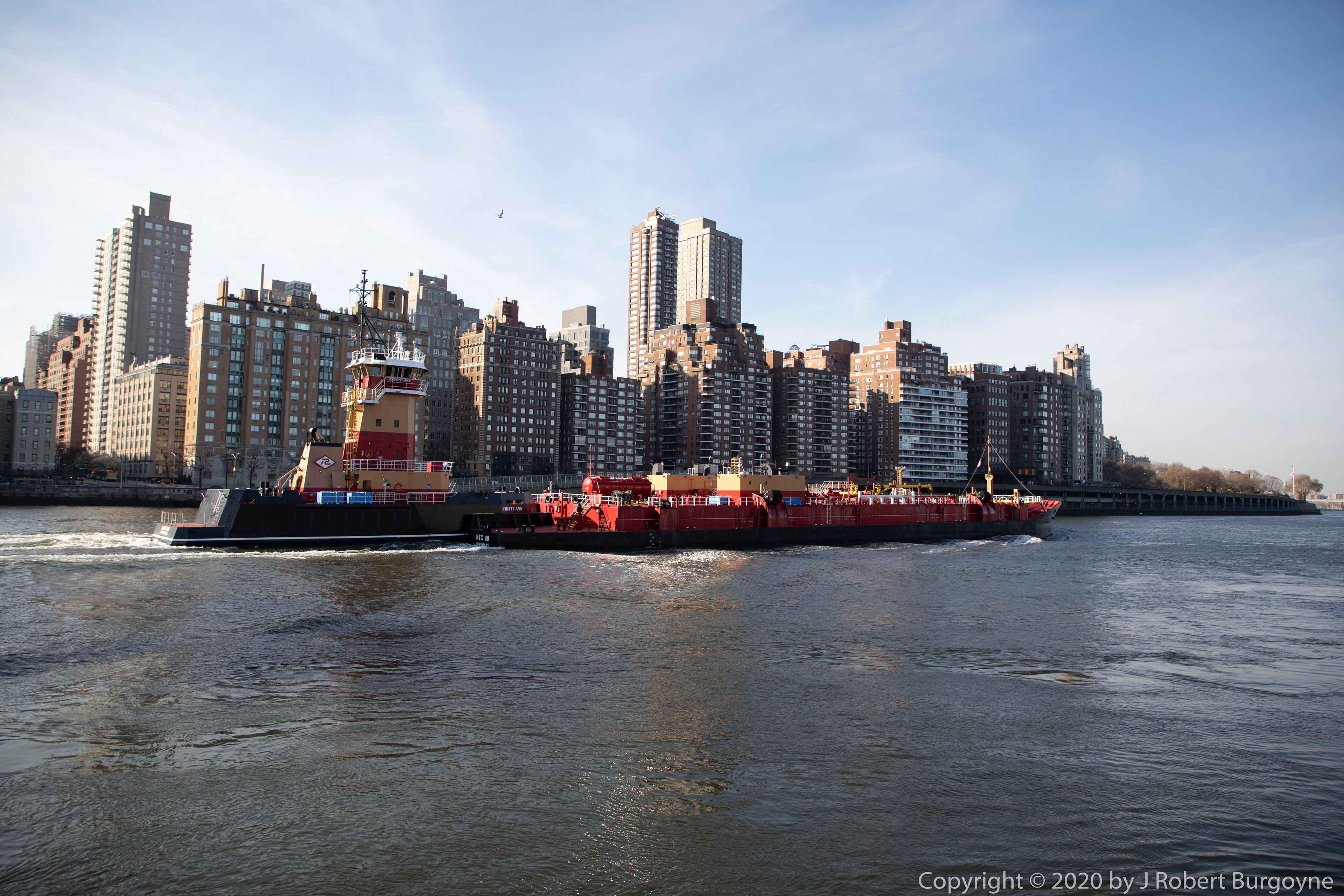 Tugboat Kristy Ann pushing a barge north on the East River.