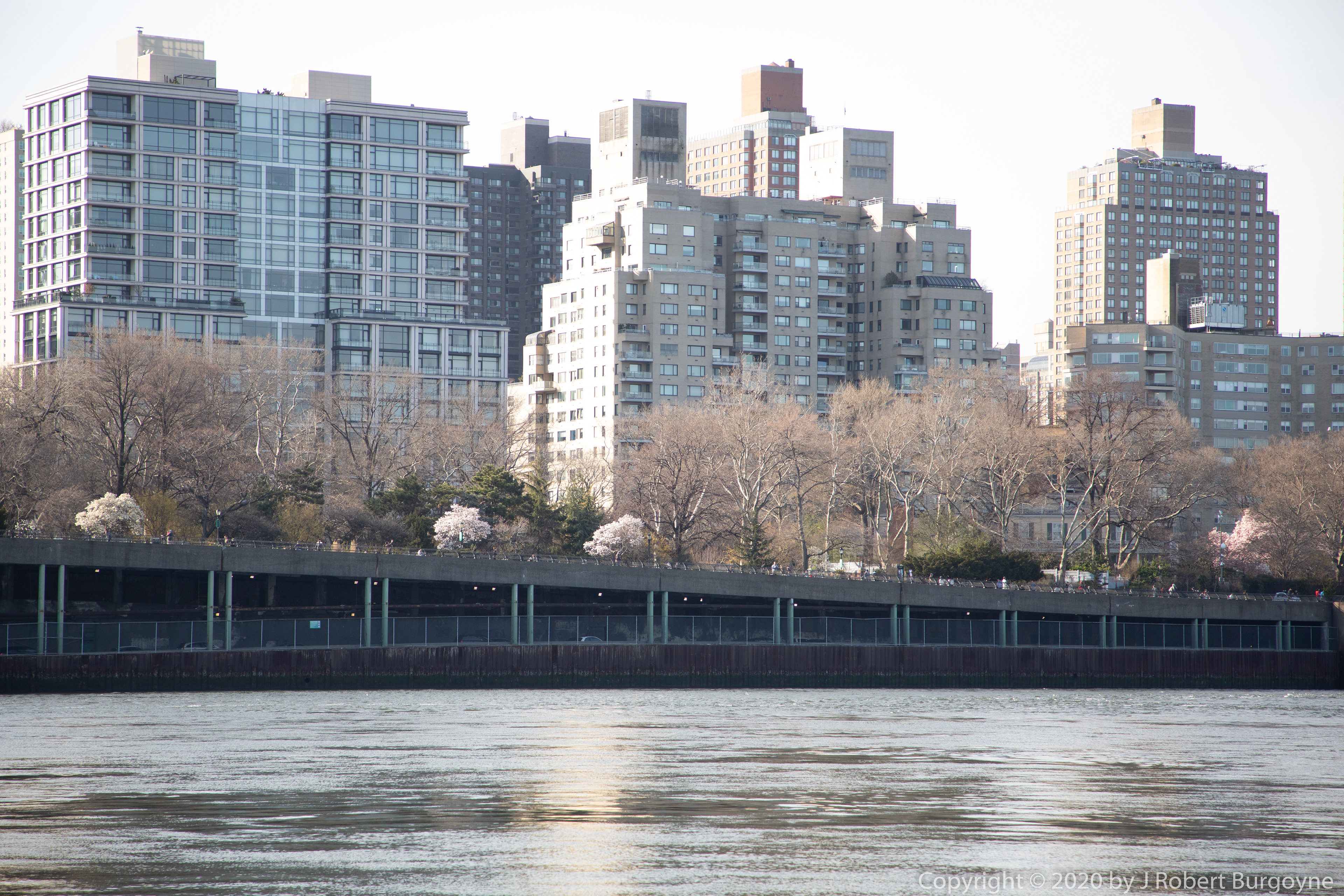 Looking north up the East River, from Roosevelt Island. Upper East Side of Manhattan at top left.